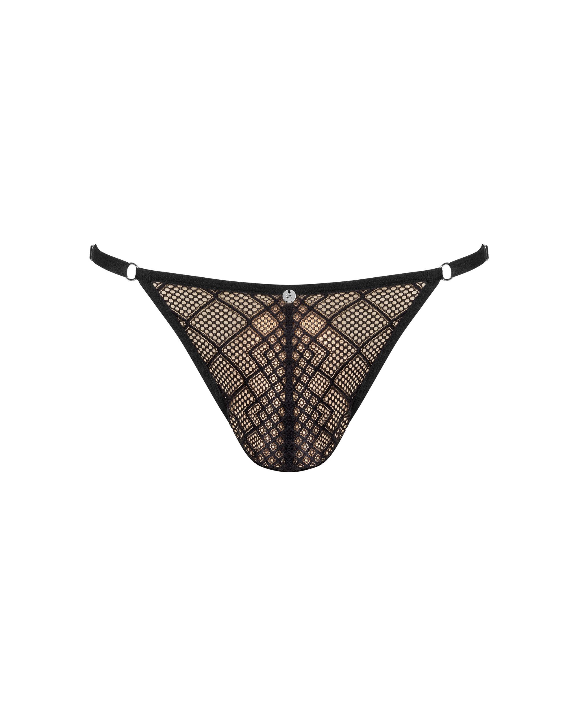 Deze zwarte string voor mannen is een schot in de roos. Met dunne bandjes voorzien van metalen ringen en licht doorschijnende stof, trekt deze string onmiddellijk de aandacht. Het diamantpatroon voegt een vleugje elegantie toe aan deze verleidelijke look, waardoor je altijd in het middelpunt van de belangstelling staat.